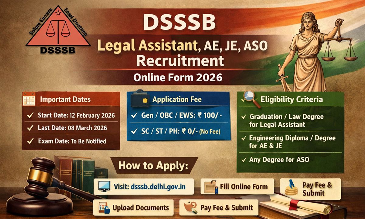 The Delhi Subordinate Services Selection Board (DSSSB) has released an official notification for the recruitment of Legal Assistant, Assistant Engineer (AE), Junior Engineer (JE), and Assistant Section Officer (ASO) posts.