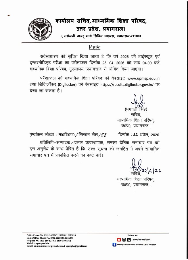 The Uttar Pradesh Madhyamik Shiksha Parishad (UPMSP) s all set to declare the UP Board Class 10th and 12th Result 2026 today at 4 PM on its official website. Students who appeared in the board examinations conducted between 18 February and 12 March 2026 will be able to check their results online using their roll number, district, and captcha code. Once released, the direct result link will be activated for quick access.